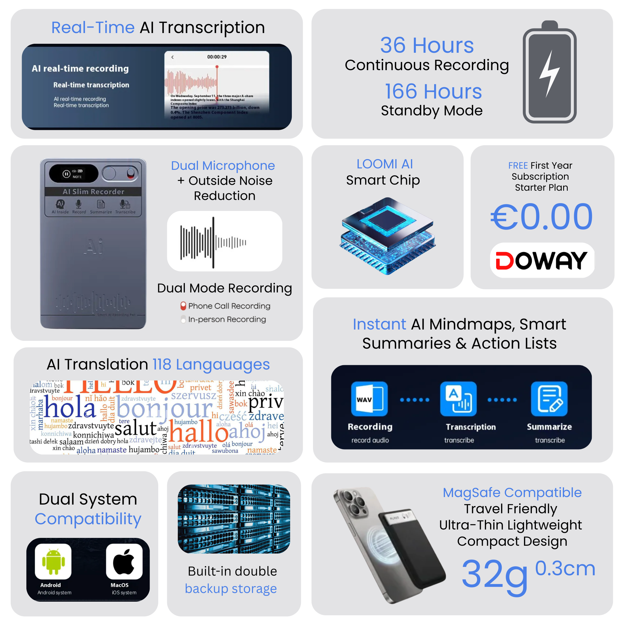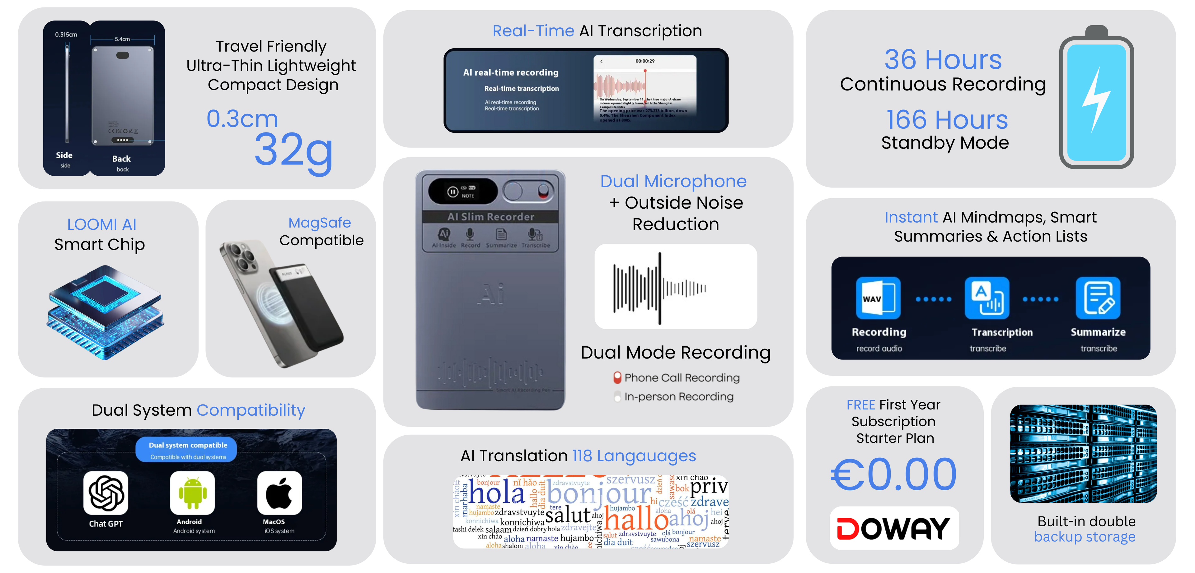 Every detail of the LOOMI Smart AI Recorder has been crafted for one purpose — to do more, faster, and smarter. From its ultra-thin design to its next-generation AI engine, LOOMI doesn’t just record — it understands, translates, and delivers clarity where others can’t. Because performance isn’t just about specs — it’s about results.